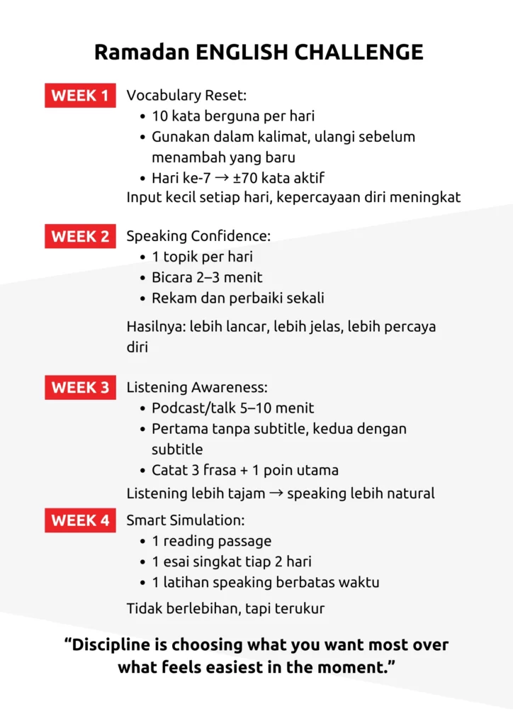 Ramadan sudah melatih disiplin. Tantangan ini hanya mengarahkan disiplin itu ke target Bahasa Inggris kalian.