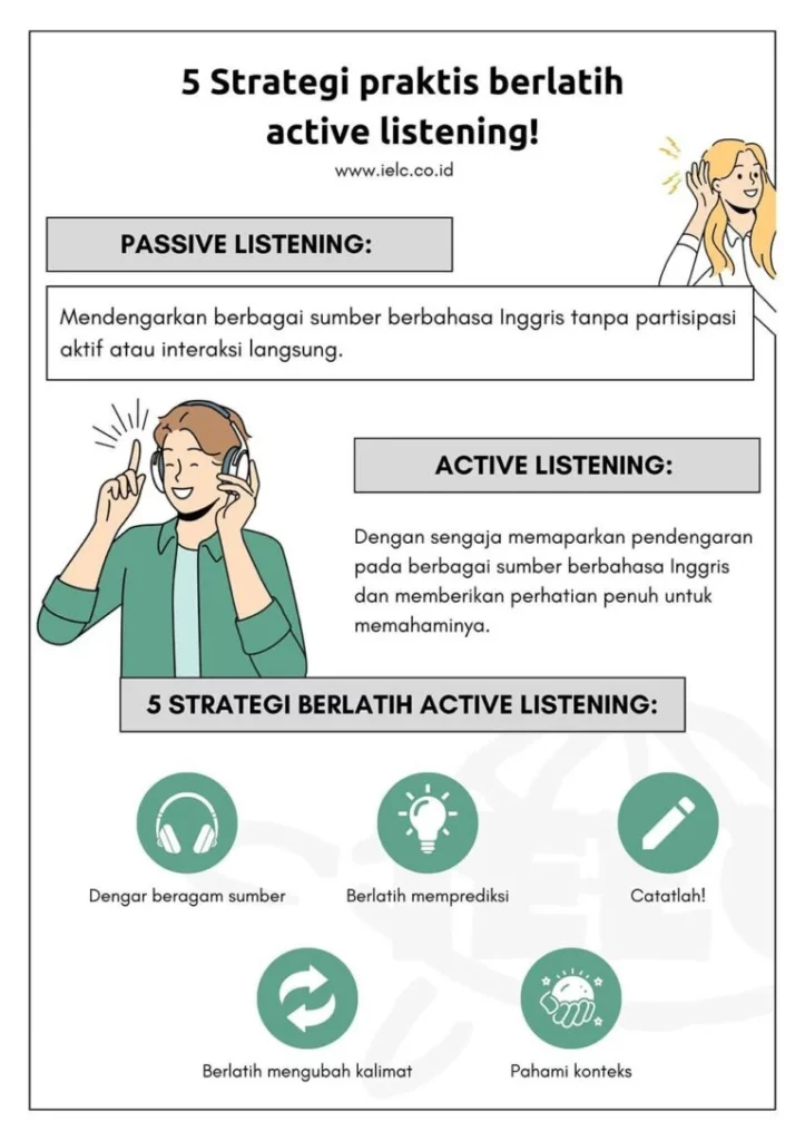 Active listening seumpama senjata rahasia. Lebih dari sekedar membiarkan kata-kata Bahasa Inggris mengalir ke telinga kalian; melainkan tentang benar-benar memahami, terlibat dan merespons apa yang kalian dengar.