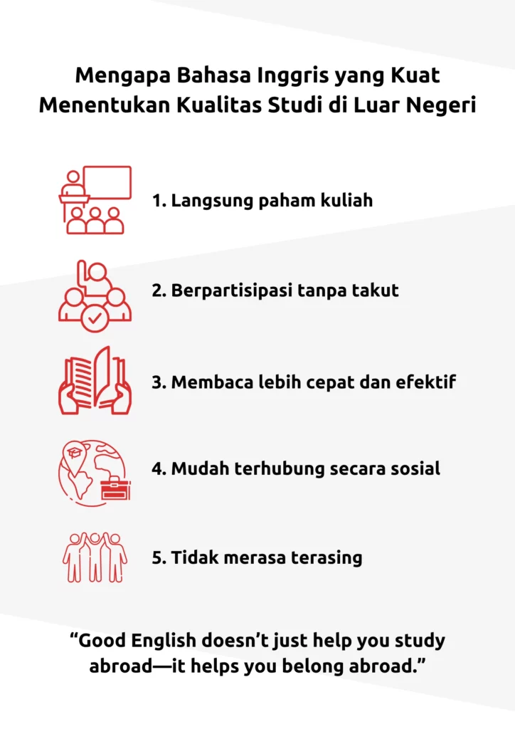 Jika kalian bermimpi berkembang di luar negeri, bukan sekadar bertahan, maka berinvestasi pada Bahasa Inggris adalah langkah paling cerdas dan strategis yang bisa kalian ambil.