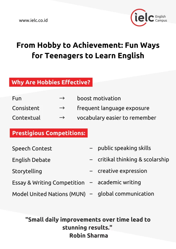 Learning English doesn’t have to be rigid or boring. Hobbies like listening to music, watching films, gaming, or creating digital content can naturally boost language skills. Beyond fun, these hobbies can open doors to prestigious competitions—from speech contests, debates, and storytelling to Model United Nations.