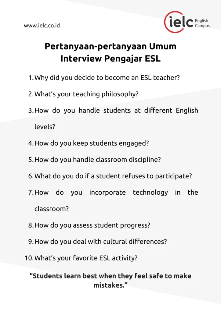 Berikut 12 pertanyaan wawancara guru ESL yang paling umum, beserta contoh jawaban dalam Bahasa Inggris yang bisa kalian adaptasi sesuai gaya masing-masing.
